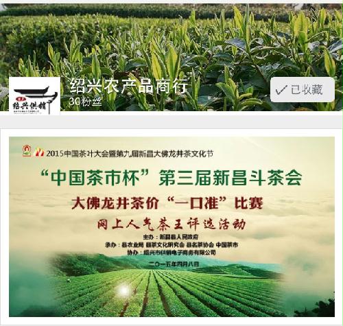 4月8日,2015中国茶叶大会暨第九届新昌大佛龙井茶文化节在新昌中国茶市举行,市供销总社党委书记、主任阮建明同志应邀出席了开幕式,新成立的绍兴市供销电子商务有限公司首次亮相中国茶叶节,协办“中国茶市杯”第三届新昌大佛龙井斗茶会。